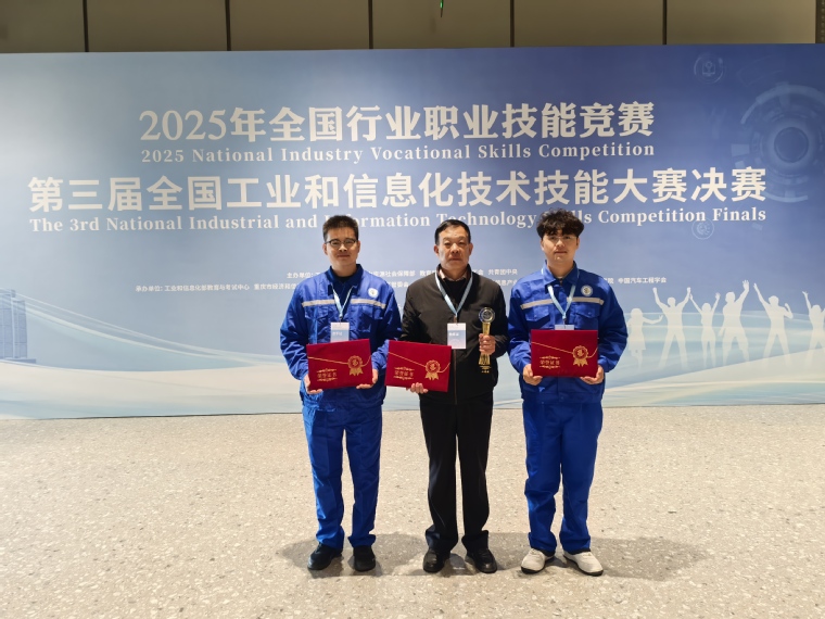 2025年11月28日,由工业和信息化部、人力资源社会保障部、教育部、中华全国总工会和共青团中央共同主办的“2025年全国行业职业技能竞赛——第三届全国工业和信息化技术技能大赛”在重庆科学会堂圆满落幕。我校新能源汽车学院聂双印、石金磊两位教师组成的代表队,在竞争激烈的“智能硬件装调员”赛项中发挥出色,荣获全国二等奖。