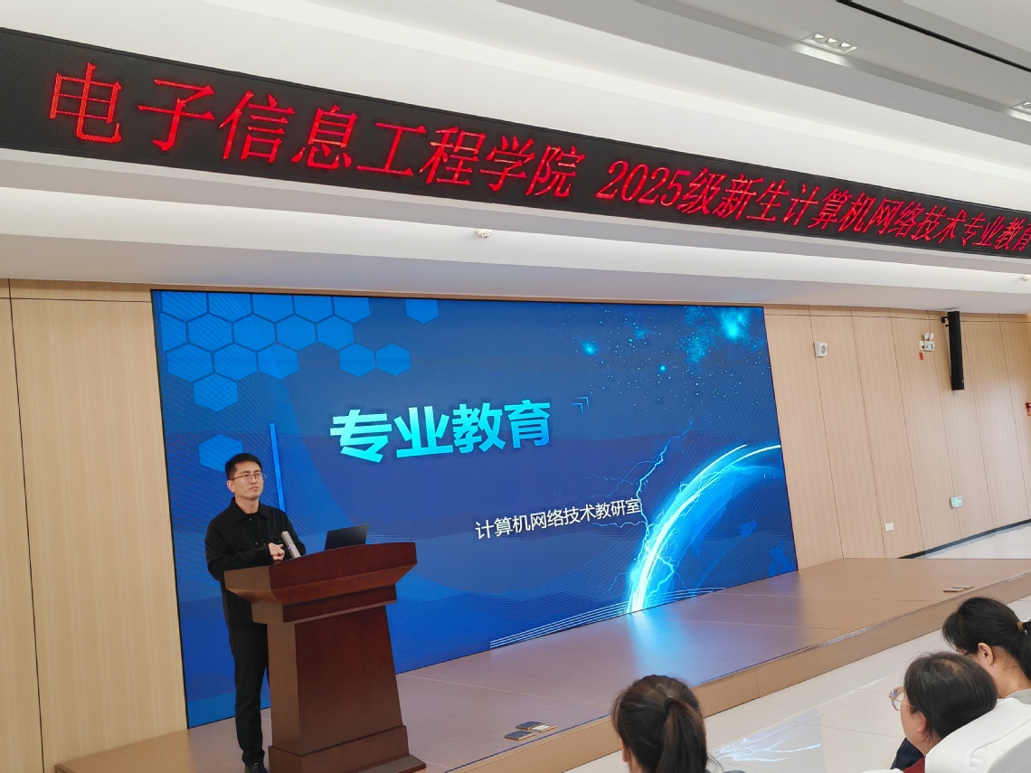 9月19日,电子信息工程学院计算机网络技术专业举行专业教育与师生见面会。计算机网络技术教研室全体教师与学院领导参加会议。于艳朋副院长首先介绍学院专业建设概况与专业教育的意义。郭家赫老师从行业现状、专业课程设置、培养阶段安排、技能竞赛与证书、就业形势与职业规划、实习安排与学历提升几个方面进行详细介绍。最后全体专业课教师与学生亲切见面,介绍互动。不仅拉近师生距离,更为后续专业教学与人才培养建立互信与进步的桥梁。