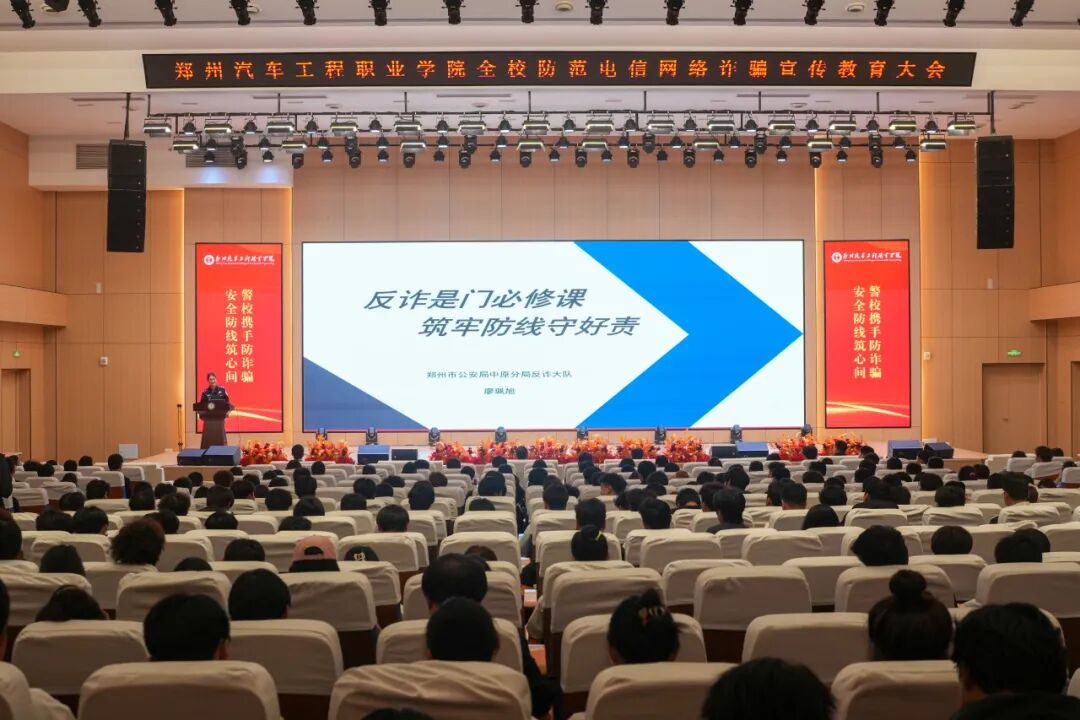 为进一步做好防范电信网络诈骗工作,切实筑牢校园安全防线,全面提升师生识诈、防诈、拒诈能力,4月14日下午,我校在学术交流中心三楼报告厅召开全校防范电信网络诈骗宣传教育大会。郑州市公安局中原分局反诈大队廖珮旭警官、柳湖派出所苗云占警官受邀作专题培训。校长助理臧俊炎,保卫处副处长牛冬、学生处副处长陈磊,各二级学院学工办主任、全体辅导员、中职学院班主任、宿管员及各班班长、团学骨干、寝室长和学生代表等600余名师生参会。会议由陈磊主持。