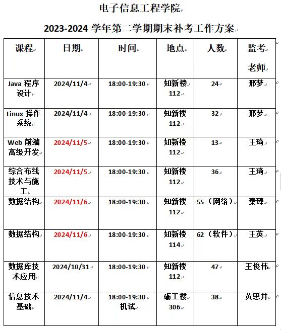 电子信息工程学院根据软件与计算机网络技术专业人才培养方案(2023级),制定2024年春季考试补考工作安排如下: