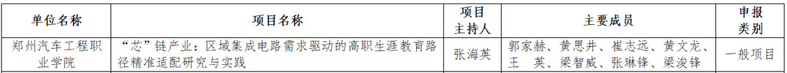 近日,郑州市教育局办公室公布2025年度郑州地方高校生涯教育教学改革研究与实践项目立项名单,我院申报项目成功入选。此次立项标志着我院在“芯”链产业与职业教育融合领域的研究与实践成果,获得教育部及相关主管部门的高度认可。