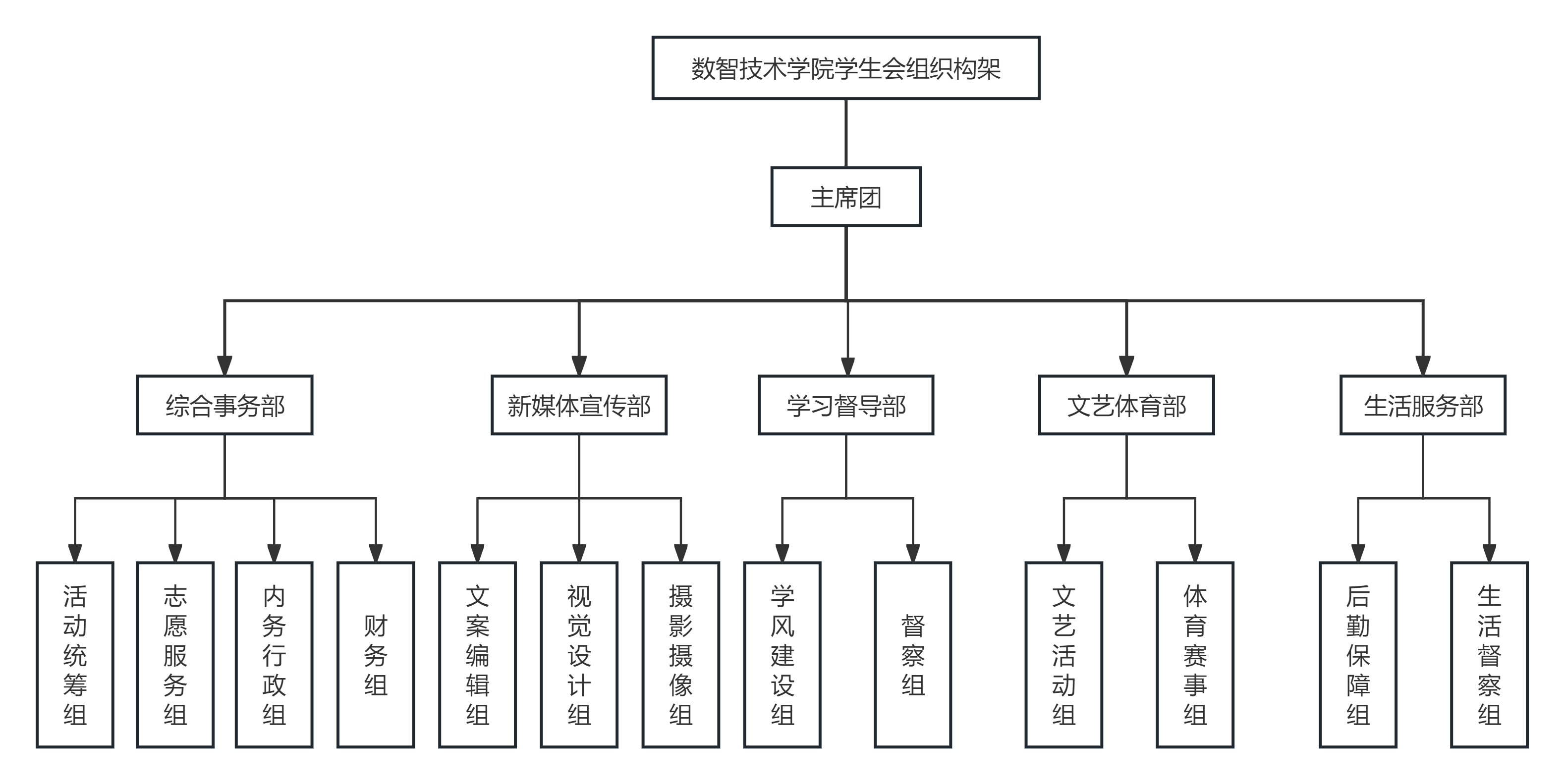 学生会下设主席团、综合事务部、新媒体宣传部、学习督导部、文艺体育部、生活服务部等多个职能部门,各部门分工明确、协同合作,共同致力于搭建学院与学生之间沟通的桥梁,丰富同学们的校园文化生活,提升学生的综合素质。