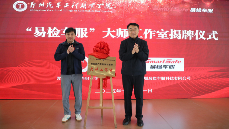 在全体与会人员的见证下,薛培军与郭一立共同为“易检车服”大师工作室揭牌。热烈的掌声标志着校企共建的实践平台正式落地运营,为后续深度合作奠定基石。