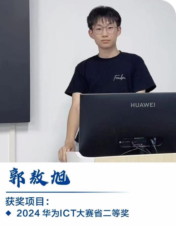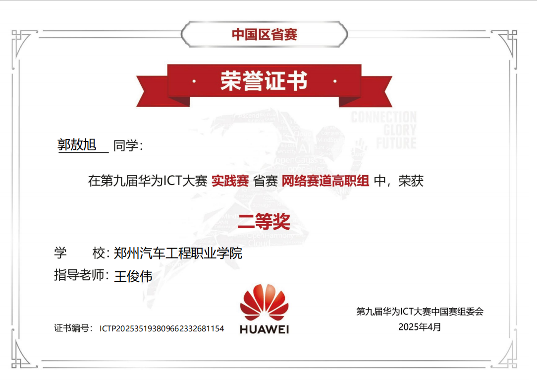 郭敖旭,男,中国共产主义青年团团员,郑州汽车工程职业学院计算机网络工程学院,计算机网络2303班班长。曾获得中国区省赛,第九届华为ICT大赛实践赛省赛网络赛道高职组中,荣获二等奖、2024年新华三杯全国大学生数字技术大赛中取得,河南省赛/三等奖、校奖学金二等奖、H3C认证路由交换网络工程师、郑州汽车工程职业学院优秀学生班干部、郑州汽车工程职业学院拔河比赛冠军、郑州汽车工程职业学院征文大赛 一等奖、郑州汽车工程职业学院男子跳高 优秀运动员、郑州汽车工程职业学院男子跳远优秀运动员。