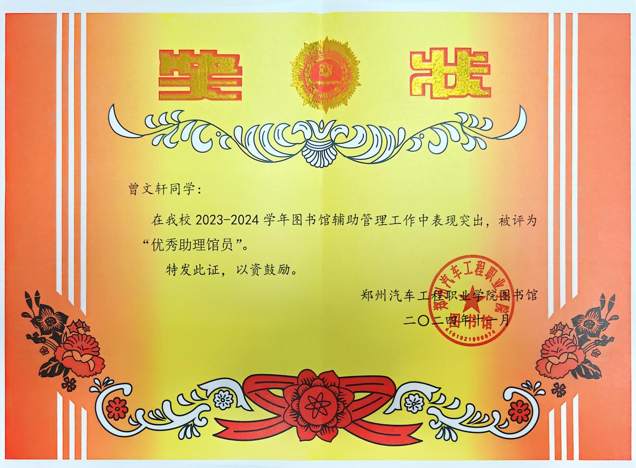 曾文轩,女,中国共产主义青年团团员,新能源汽车学院新能源汽车技术专业学生,获得郑州市三好学生、国家励志奖学金、新能源汽车学院先进个人等荣誉。