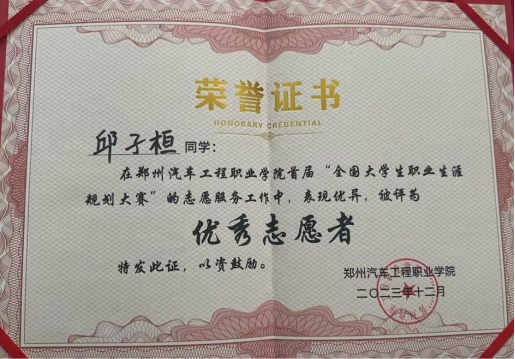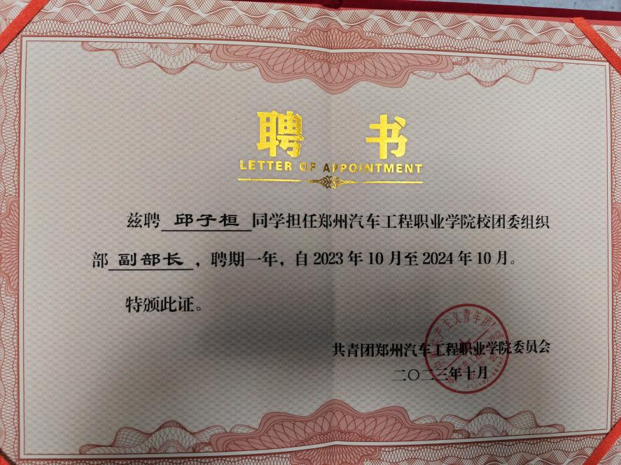 邱子桓,男,中国共产主义青年团团员,新能源汽车学院新能源汽车技术专业学生,现担任郑州汽车工程职业学院校学生会执行主席、国旗护卫队副队长、新能源汽车学院组织部部长,曾荣获河南省三好学生、国家励志奖学金、优秀学生干事、新能源汽车学院优秀工作者、新能源汽车学院优秀志愿者、新能源汽车学院先进个人等荣誉。