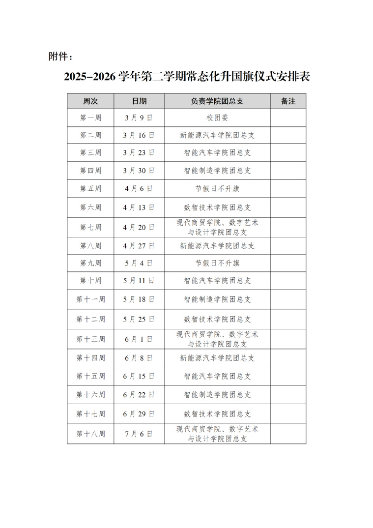 1.各学院团总支要高度重视升国旗仪式,认真做好动员和组织工作。按照《2025-2026学年第二学期常态化升国旗仪式安排表》(见附件),提前做好准备工作,组织人员按时参加。轮值学院的院领导、团总支书记、辅导员如无特殊事由都应到场参加,学院团总支亦可邀请学校当日值班的校领导、中层干部和其他教职工参加。