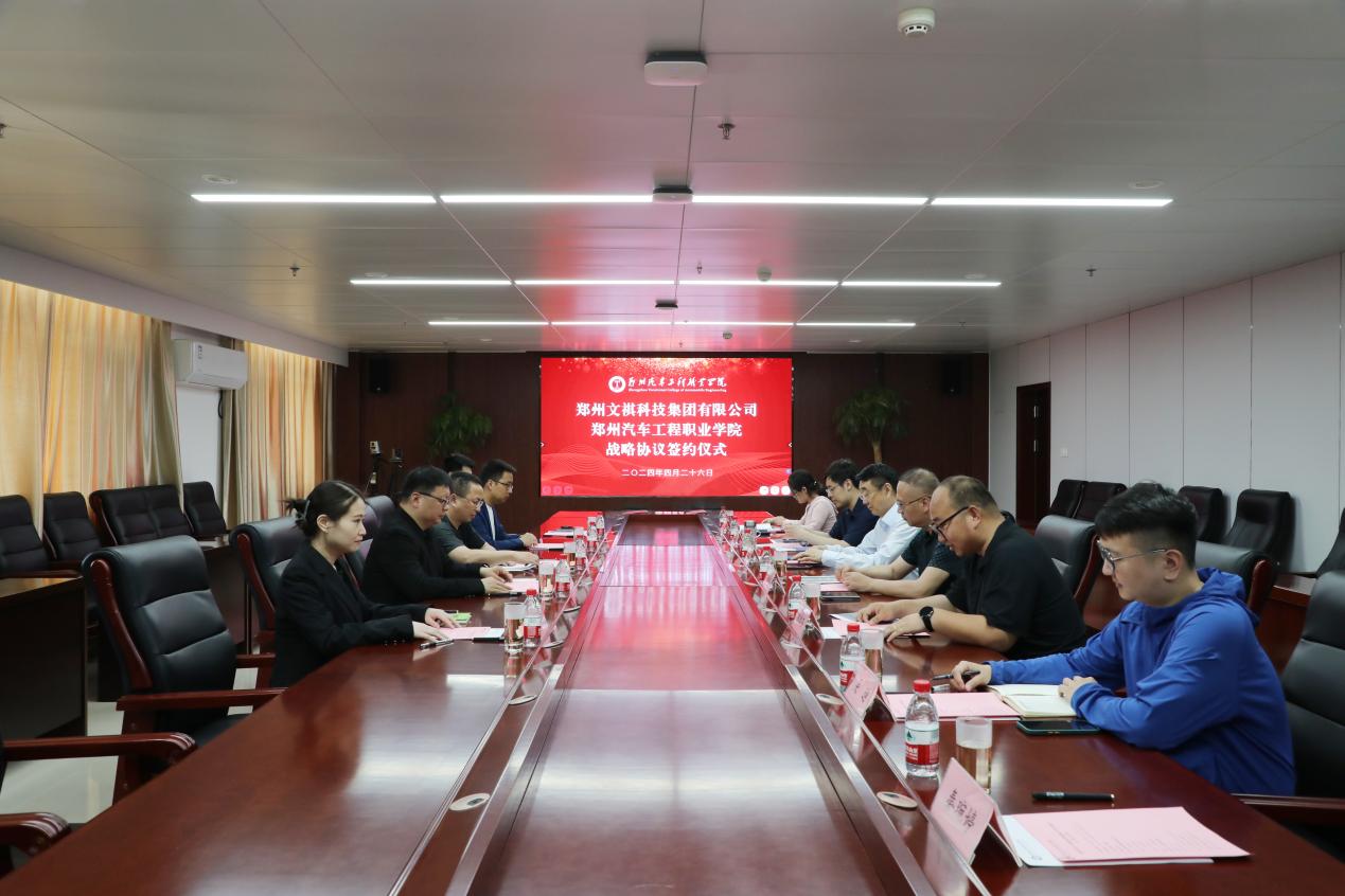 为贯彻落实《国家职业教育改革实施方案》,持续深化产教融合、推进校企合作,实现共同发展。2024年4月26日上午,郑州汽车工程职业学院与郑州文祺科技集团有限公司校企合作签约仪式在我校行政楼第一会议室隆重举行。校长薛培军、副校长王新宇、校长助理李一维、电商物流学院副院长邵瑞齐,电商物流学院实训主任吴迪,电商物流学院教研室主任王萌媛,校企合作处秦琬婷等人出席签约仪式,由电商物流学院副院长邵瑞齐主持本次会议。