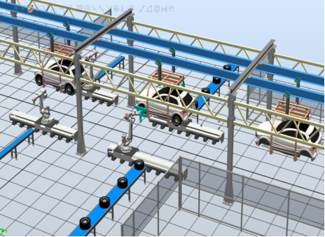 在此实训项目中,学生以工业机器人离线编程为核心,构建车轮自动装配全流程仿真模型。系统模拟车身在航吊式起重机牵引下依次到达前后轮安装位置,两侧工业机器人协同完成车轮抓取、对位及安装操作;车轮传送带与螺栓传送带根据传感器监测信号动态输送工件,机器人抓取完成后自动输送下一件。随后,两台机器人协同完成四个车轮的紧固,车身被送往检测区完成质量检查,如下图所示。