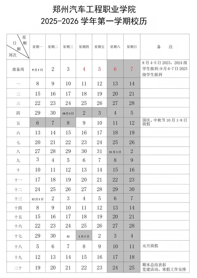 郑州汽车工程职业学院2025-2026学年第一学期校历