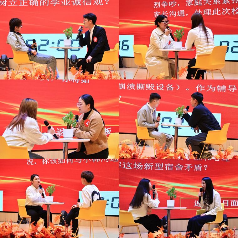 在决赛的谈心谈话环节中,面对情景模拟中的学生所提出的各类成长困惑、情绪困扰或行为问题,晋级的6位参赛选手沉着应对、循循善诱,灵活运用沟通技巧与心理辅导方法,在尊重与理解中引导学生理性认知、积极应对。现场互动真实自然,交流既有温度又有深度,生动展现了学校辅导员在日常工作中“润物细无声”的育人智慧与亲和力。该环节不仅是对业务能力的综合检验,更是一次育人风采的集中展示,将大赛氛围推向高潮。